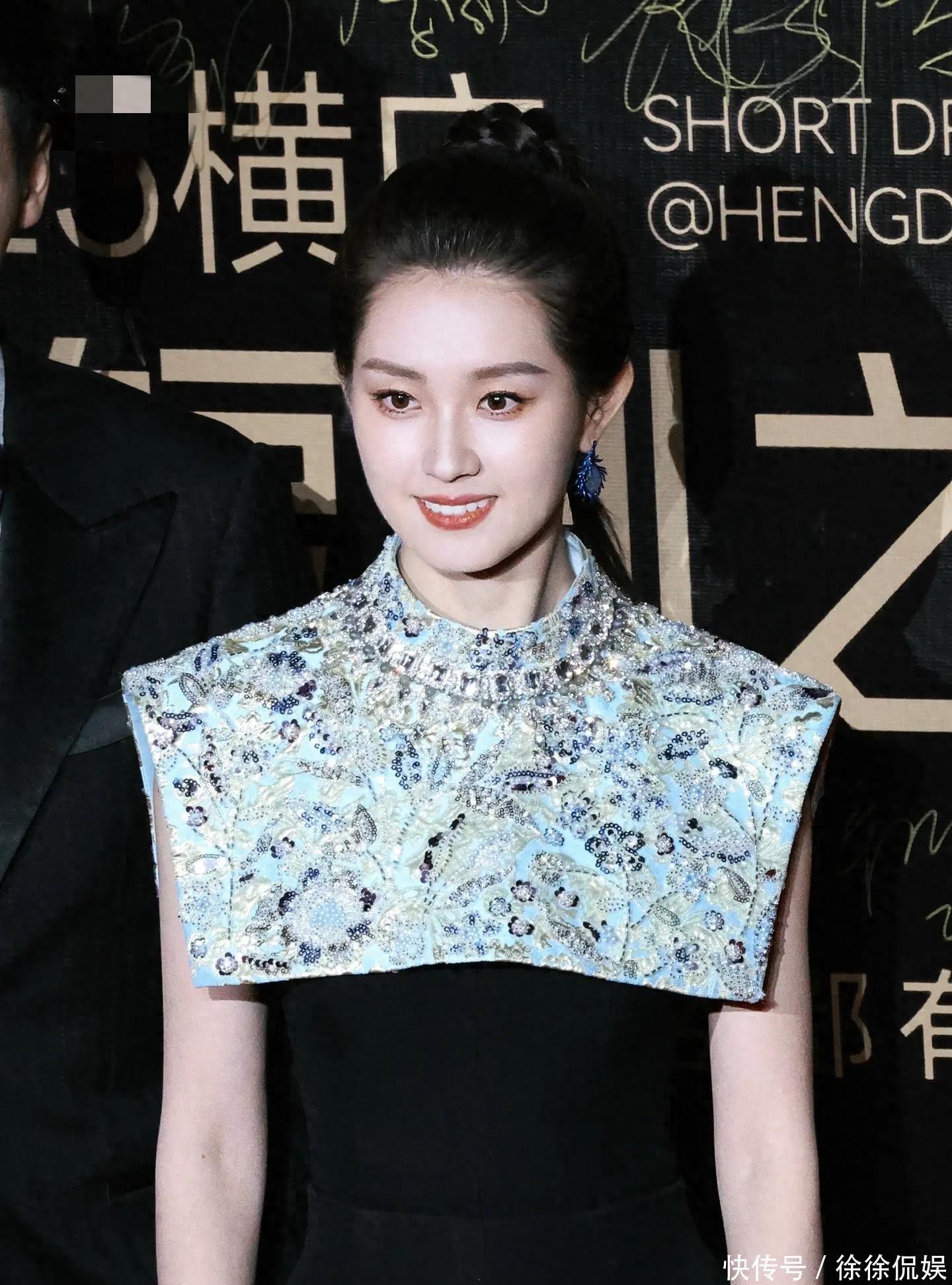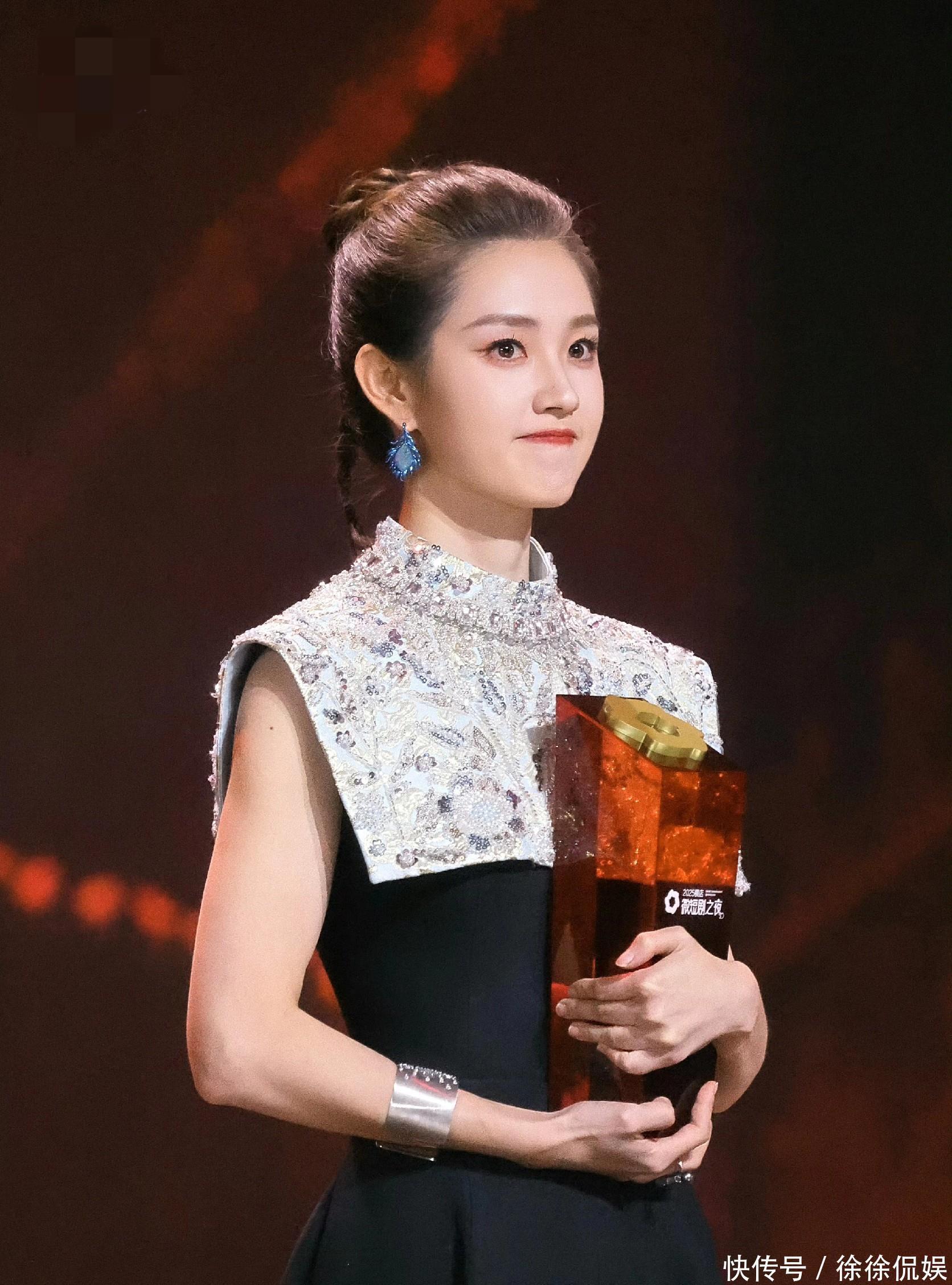 这条裙子的三次登场,刚好串起了她的演艺逆袭路。2023年第一次穿时,她刚入行不久,账户余额只剩83元,在横店简陋出租屋里拍宣传视频,那时没名气没资源,这条裙子是前辈设计师给的鼓励,藏着“勿忘初心”的嘱托。紧接着2024年,她穿着这条裙去剧集开机仪式,长发挽成发髻搭珍珠耳饰,外穿浅色西装,那时已有了几部作品,眼神里多了份坚定,只是还没被太多人关注。到了2025年“横店微短剧之夜”,红毯上众星穿高定争奇斗艳,她再次穿上这条“老伙计”,从容走上领奖台,拿下“年度号召力星耀女演员”,此刻裙子的闪钻和她的光芒相互映衬,网友直呼“这是最动人的逆袭仪式感”。